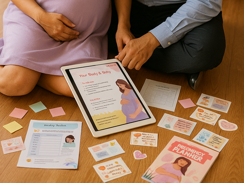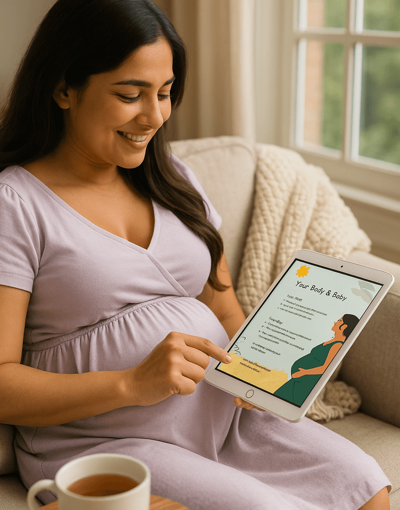 The physical kit includes a premium hardbound pregnancy journal, milestone cards, and keepsake essentials. The eBook version includes a digital journal with guided pages.